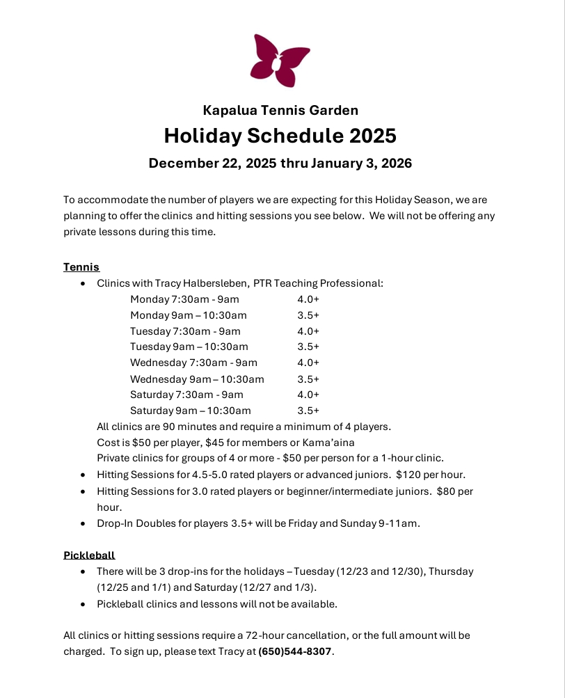 Clinics with Lisa Poulsen – $40 per player – text (808)298-9098 to reserve